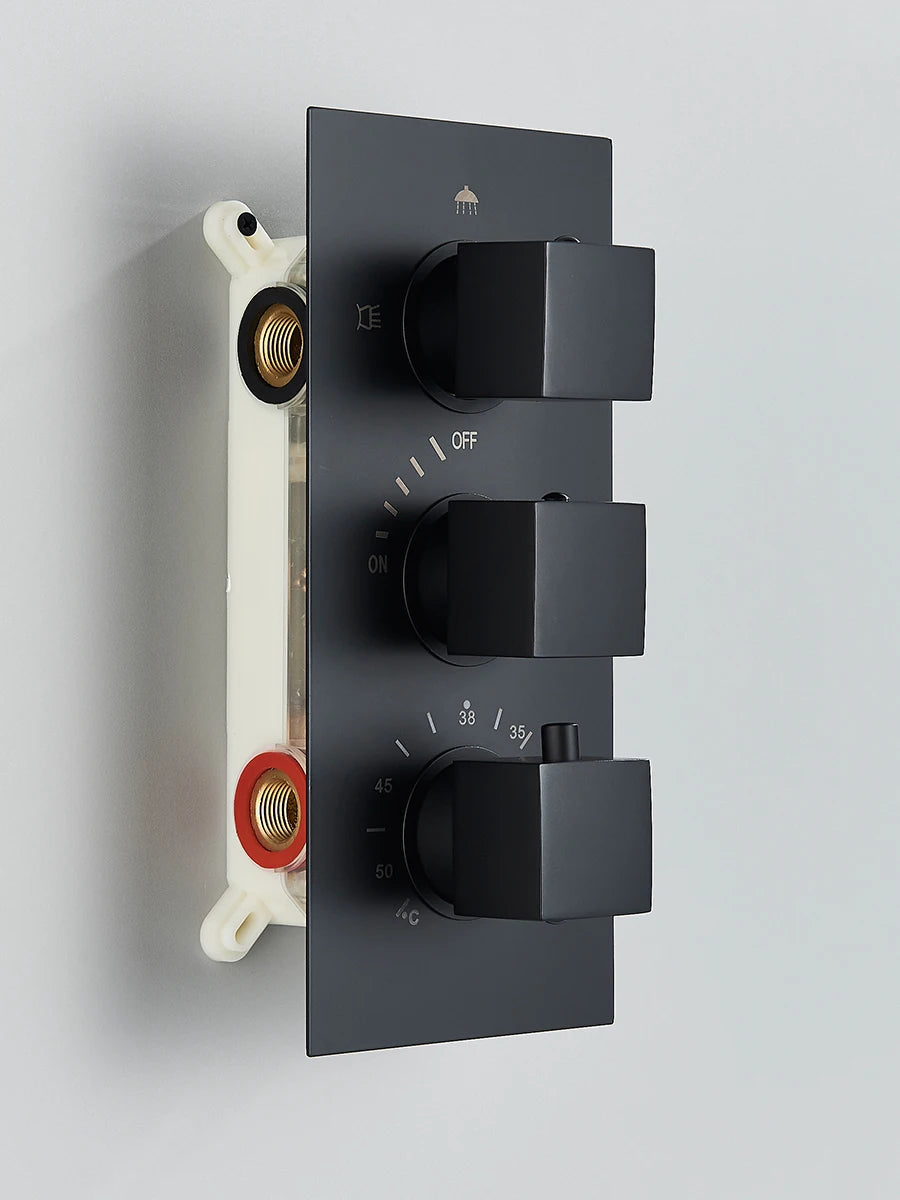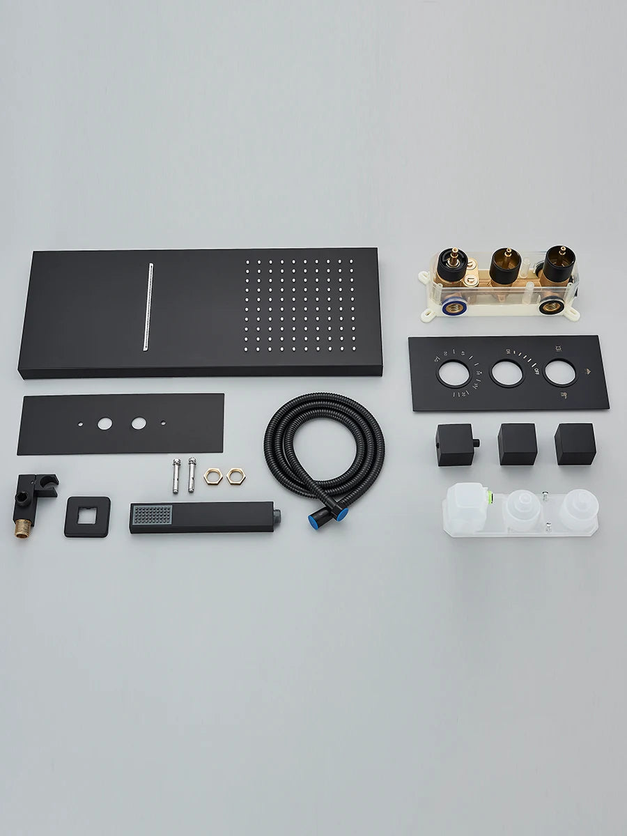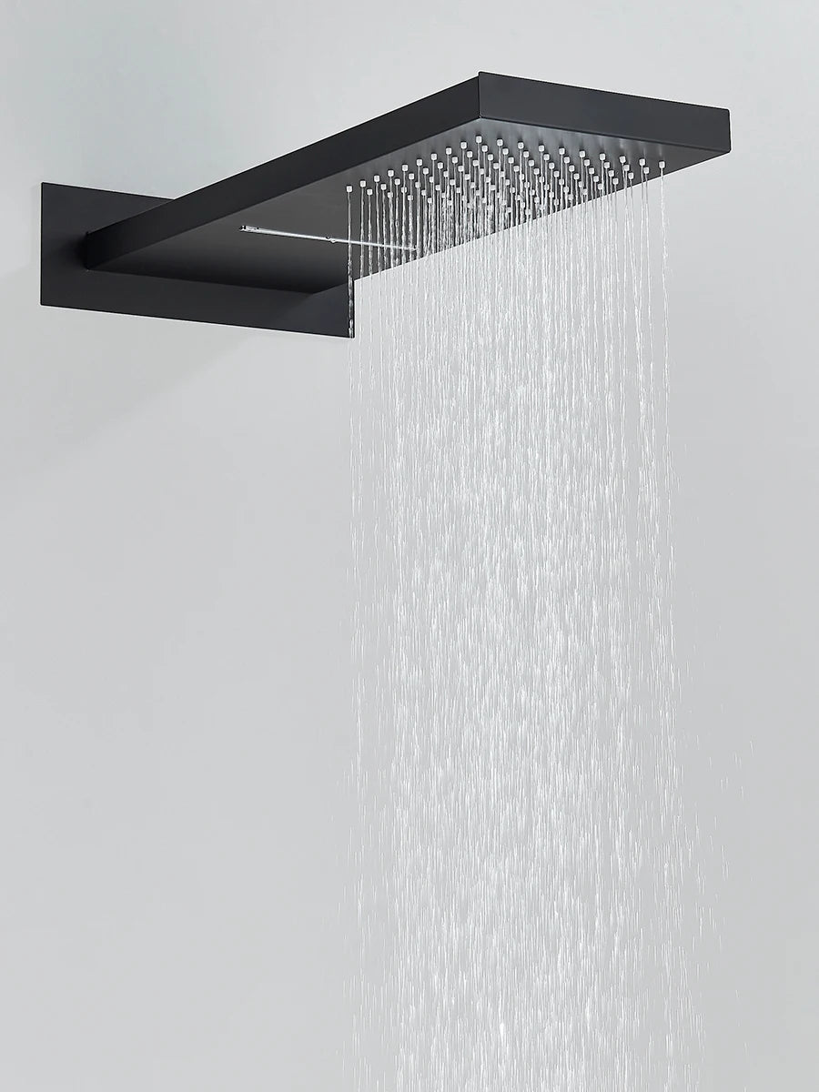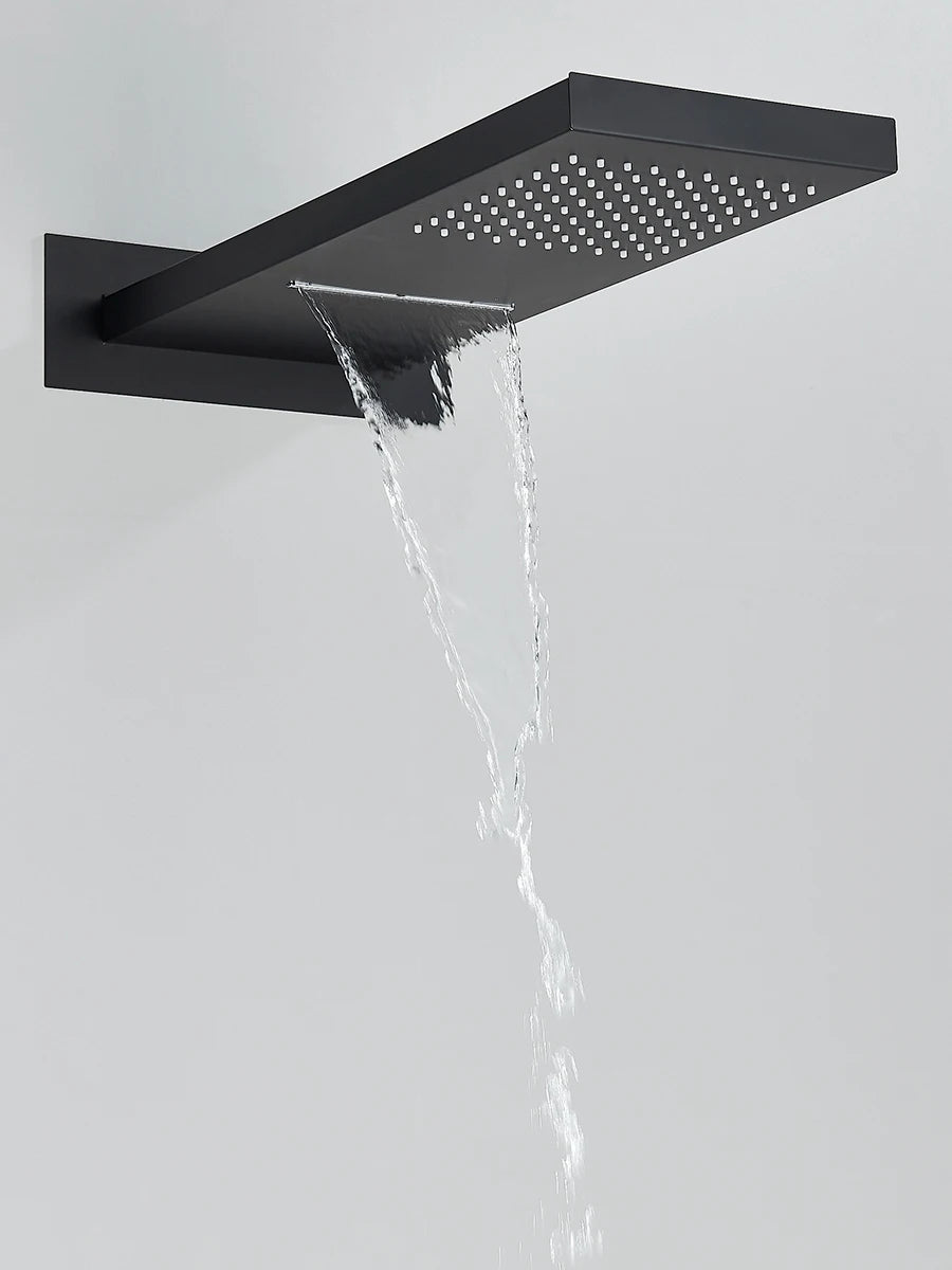 The Black Thermostatic Shower System combines advanced temperature control technology with stunning black design. This premium shower set features both rainfall and waterfall functions with a 3-way thermostatic mixer, ensuring consistent water temperature and luxurious showering experiences every time.