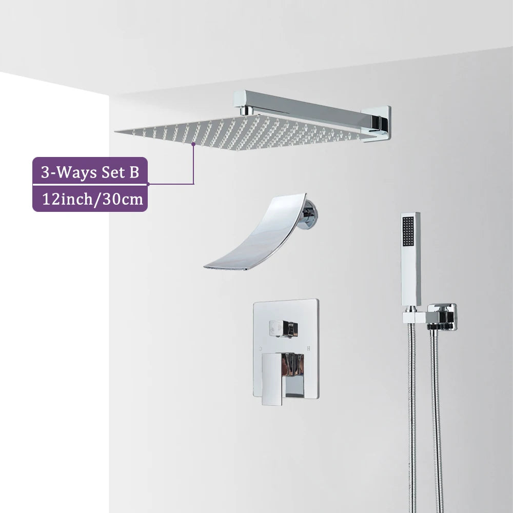 The Chrome Rainfall Shower System offers professional versatility with 2-way or 3-way configuration options. This premium brass shower set features wall-mounted embedded box control and adjustable shower head sizes from 8 to 16 inches, making it perfect for custom bathroom installations and renovations.