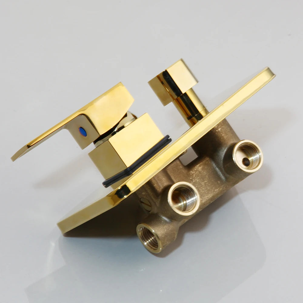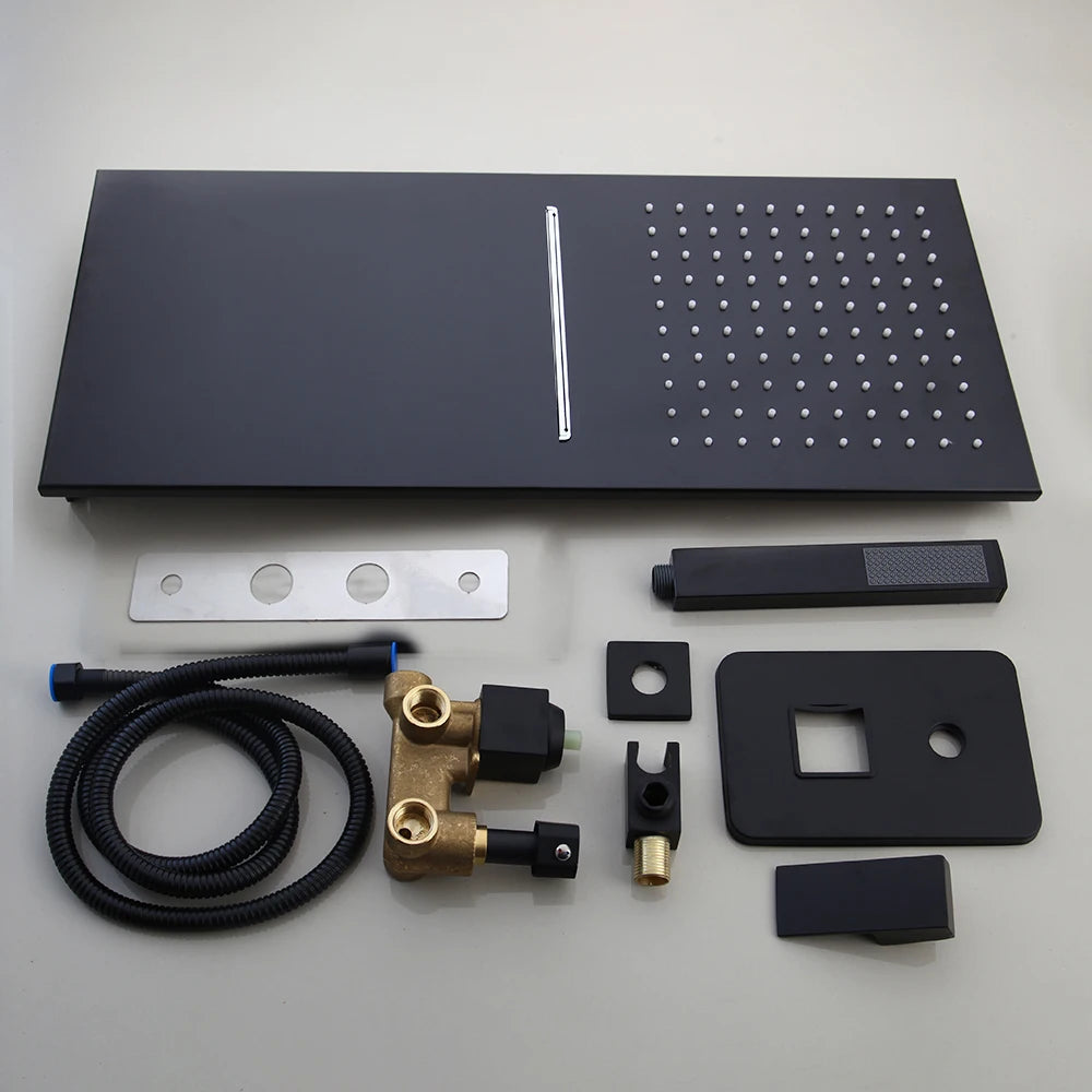 The Golden Black Shower System delivers a bold, luxurious statement with its striking black and gold finish. This premium 3-function shower set features both rainfall and waterfall shower heads plus a handheld spray, creating a versatile spa-like experience that transforms your bathroom into a personal retreat.
