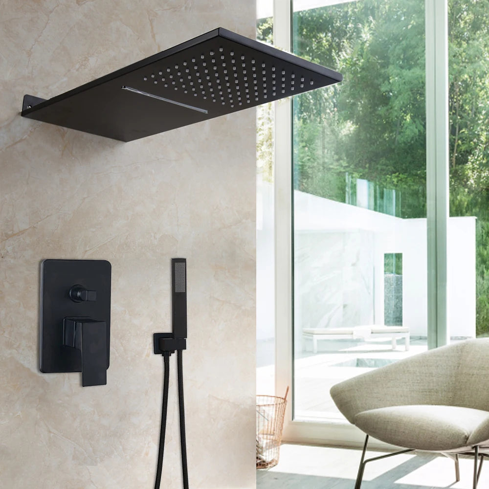 - Includes: Shower faucet set, rainfall/waterfall head, handheld spray
