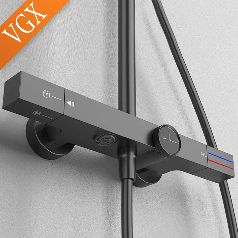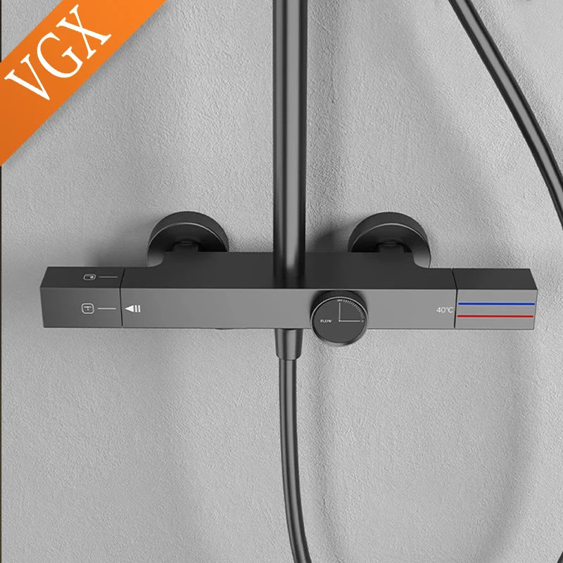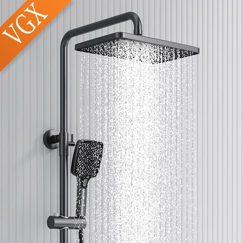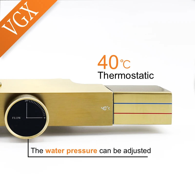 The VGX Thermostatic Shower System elevates your bathroom with stunning gold finishes and advanced temperature control technology. This premium brass rainfall shower set delivers consistent water temperature and elegant design for the discerning homeowner.
