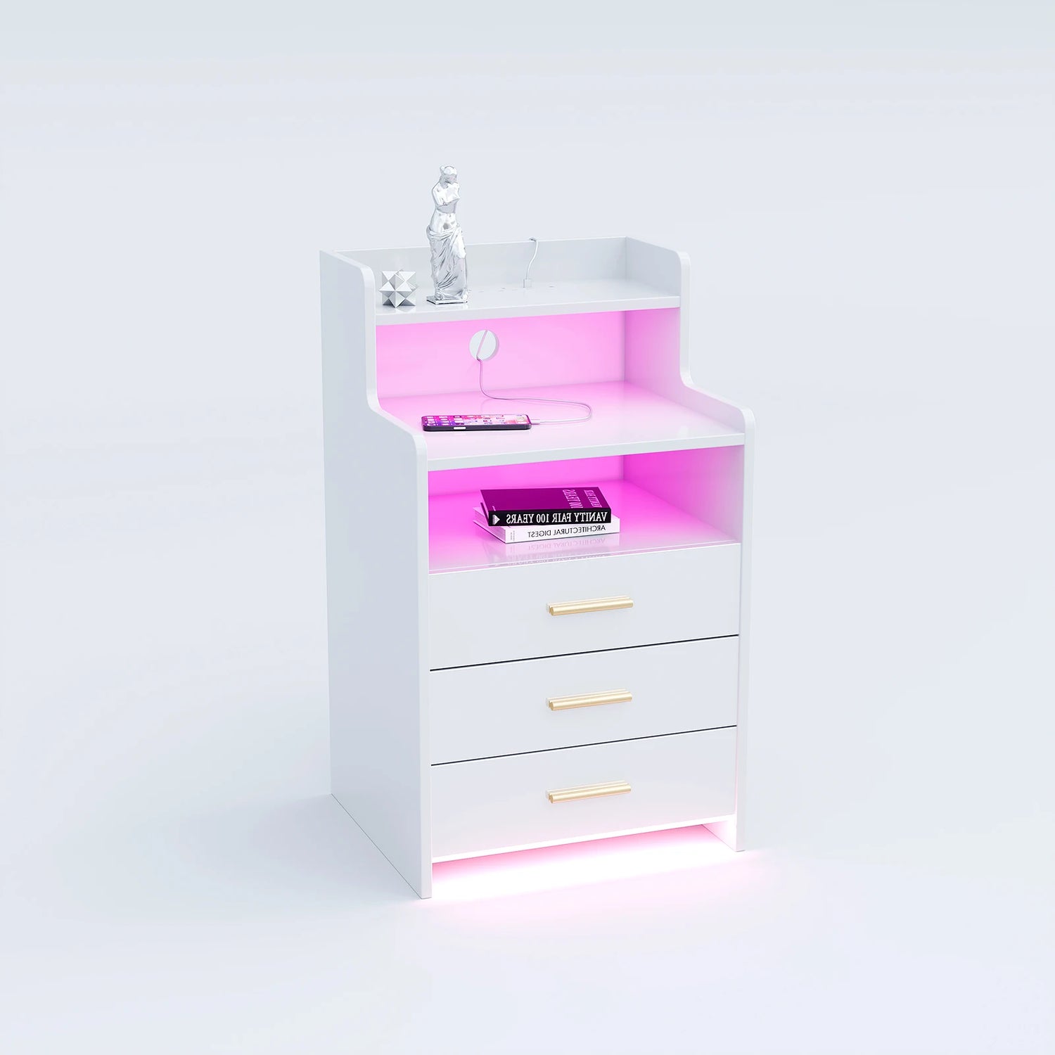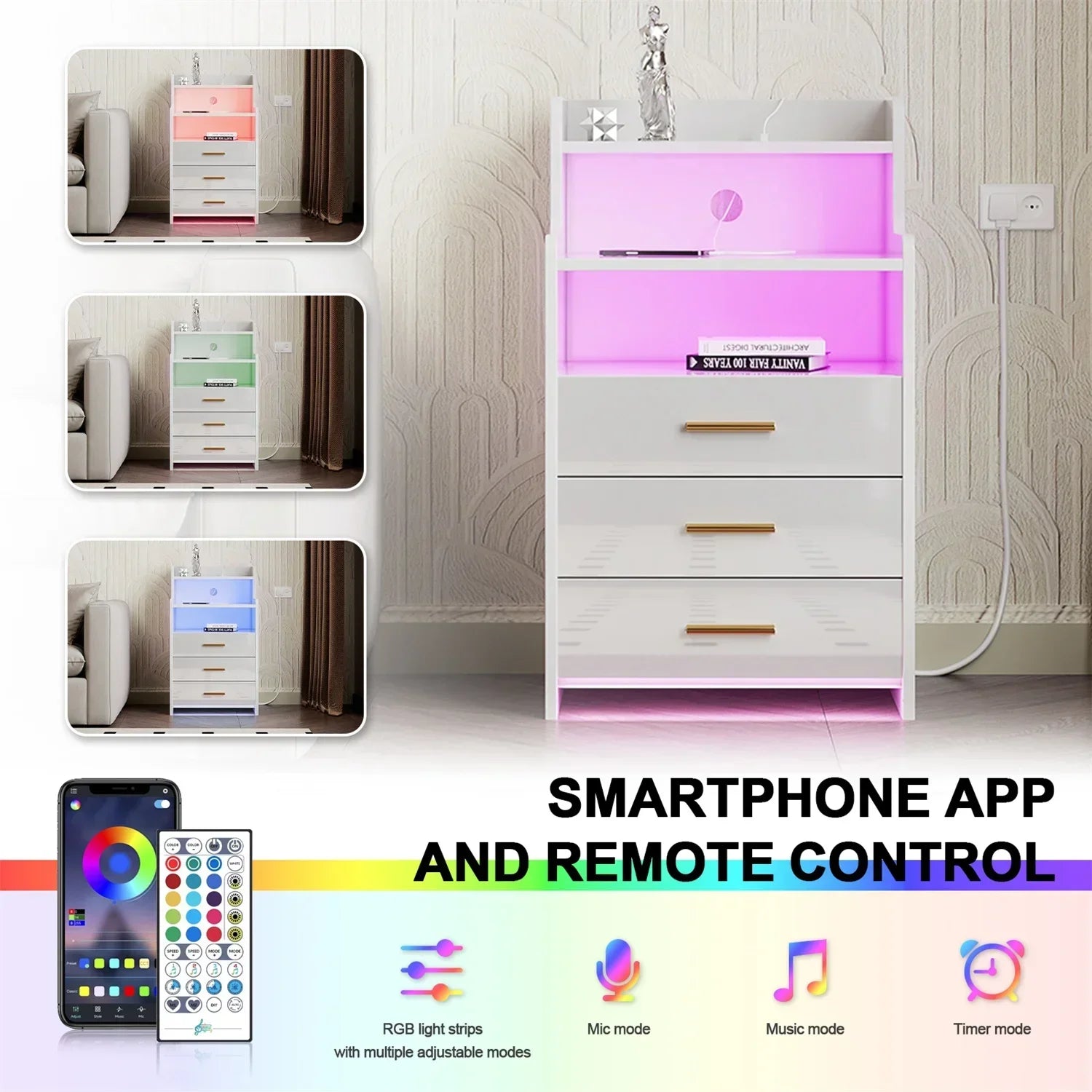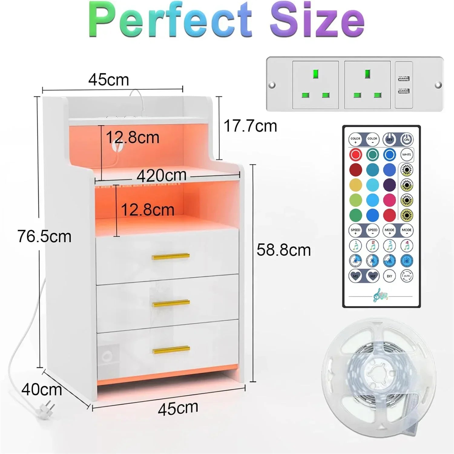 Package Includes: Bedside table, accessory screw kit, instruction manual, LED light strip with Bluetooth, 1.5m power socket (2AC+2USB)