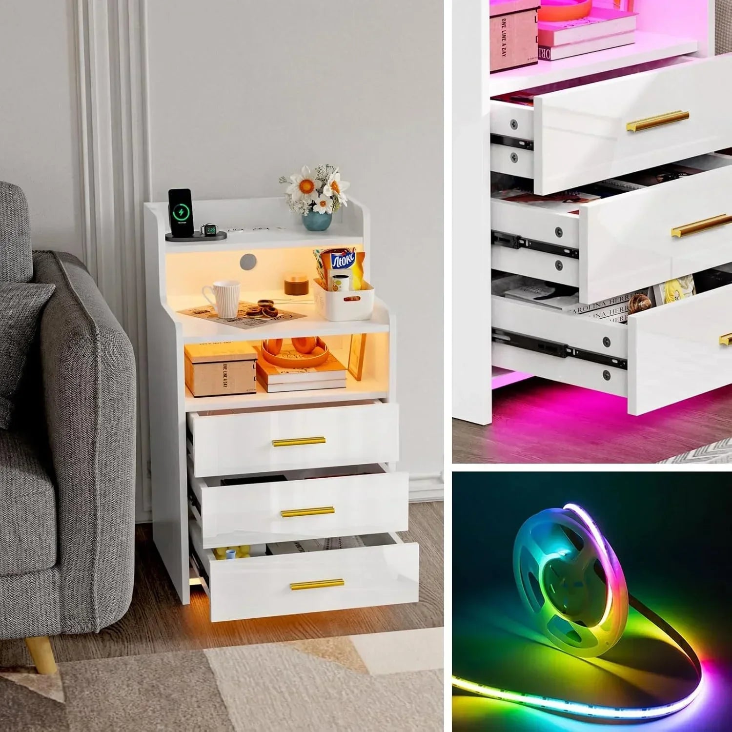 Wooden 3-Drawer Tall Nightstand - 6-Layer Storage & LED Lighting (2AC/2USB)