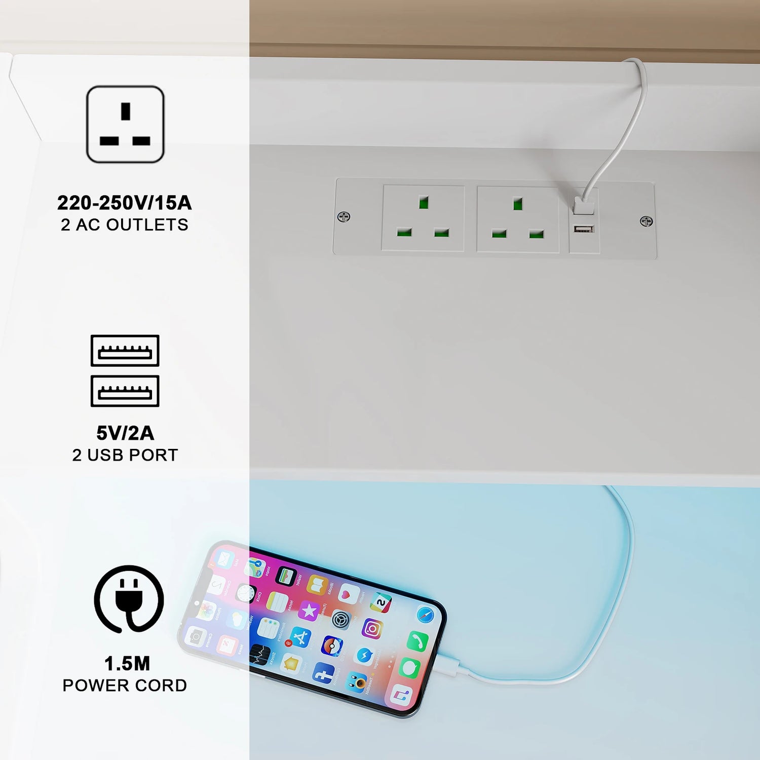 - Charging Station: 2 AC outlets + 2 USB ports (UK plug) with smart concealed cable management